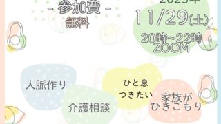 未分類 11/29(土)気軽に楽しむお話会 開催日時 11月29日(土)20時から22時、希望者は2次会でさらにお話可能。開催場所 ZOOM (参加者のみにZOOMコードお知らせ)費用 無料開催目的 10~50代のヤング・若者・ミドル・就職氷河期の介護者やひきこもり当事者、家族、専門... 2025.11.22 未分類